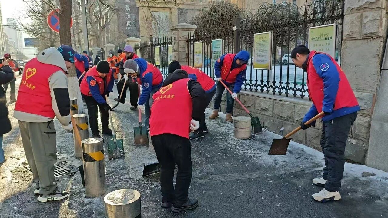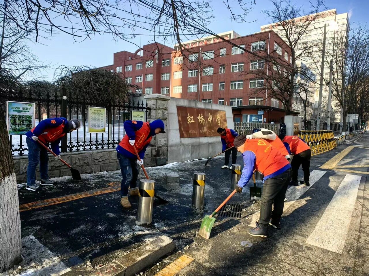 活動當天,黨員志愿者們身著紅色馬甲,準時集結(jié),參與淮北社區(qū)組織的清冰除雪志愿服務(wù)活動。針對虹橋中學(xué)校門口人行橫道積雪結(jié)冰、易滑難行的問題,志愿者們重點對該區(qū)域展開集中清理。大家手持鐵鍬、雪鏟、掃帚等工具,分工協(xié)作、齊心協(xié)力,將路面積雪與薄冰徹底鏟除清運。經(jīng)過一番努力,校門口人行橫道恢復(fù)干凈通暢,通行條件顯著改善,為師生的安全出行提供了堅實保障。
