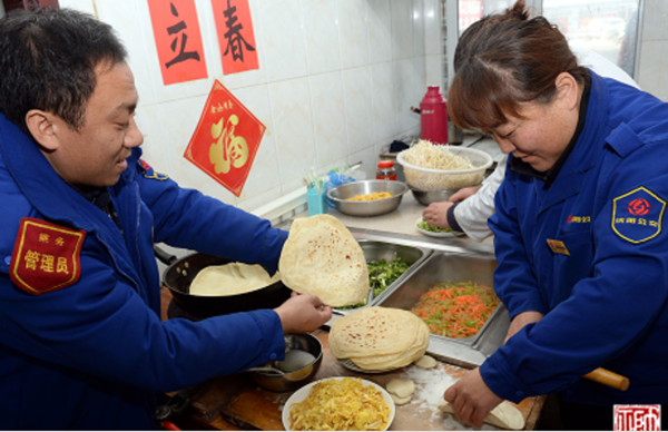 當(dāng)天,記者在211、222路大北門(mén)終點(diǎn)站看到,面積不足10平方米的食堂里,瓶瓶罐罐各種調(diào)料應(yīng)有盡有,兩名身穿制服的女調(diào)度員正在烙餅,她們身后的“大廚”正將豆芽、粉條、肉絲、蘿卜絲等食材依次放入炒鍋。終點(diǎn)站的“廚房”條件雖然簡(jiǎn)易,但大家一起干活兒的熱情絲毫不差。很快,一張張冒著熱氣的春餅就正式出鍋,炒好的卷餅菜也被盛放在保溫鍋里。