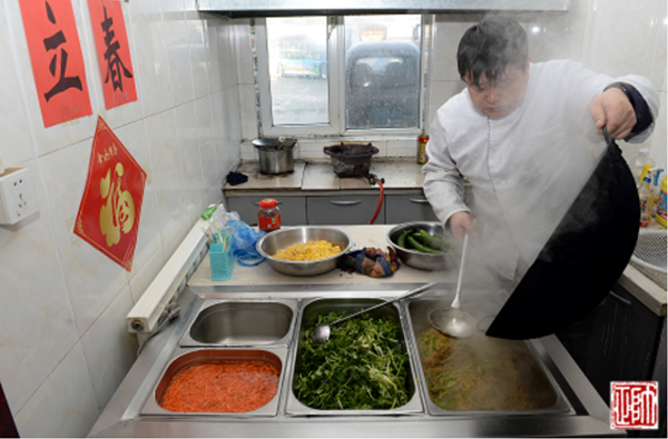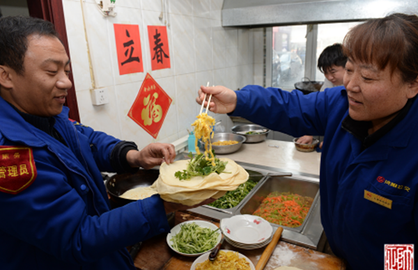 “哎呦,今天烙春餅啦!難怪老遠(yuǎn)兒就聞見(jiàn)了香味兒??欤o我先來(lái)兩張!”2月3日大年初七,是節(jié)后的第一個(gè)工作日,恰逢立春。11時(shí)左右,211路駕駛員張智剛跑完一圈兒回到大北門(mén)終點(diǎn)站,就被食堂的飯香吸引過(guò)去。
